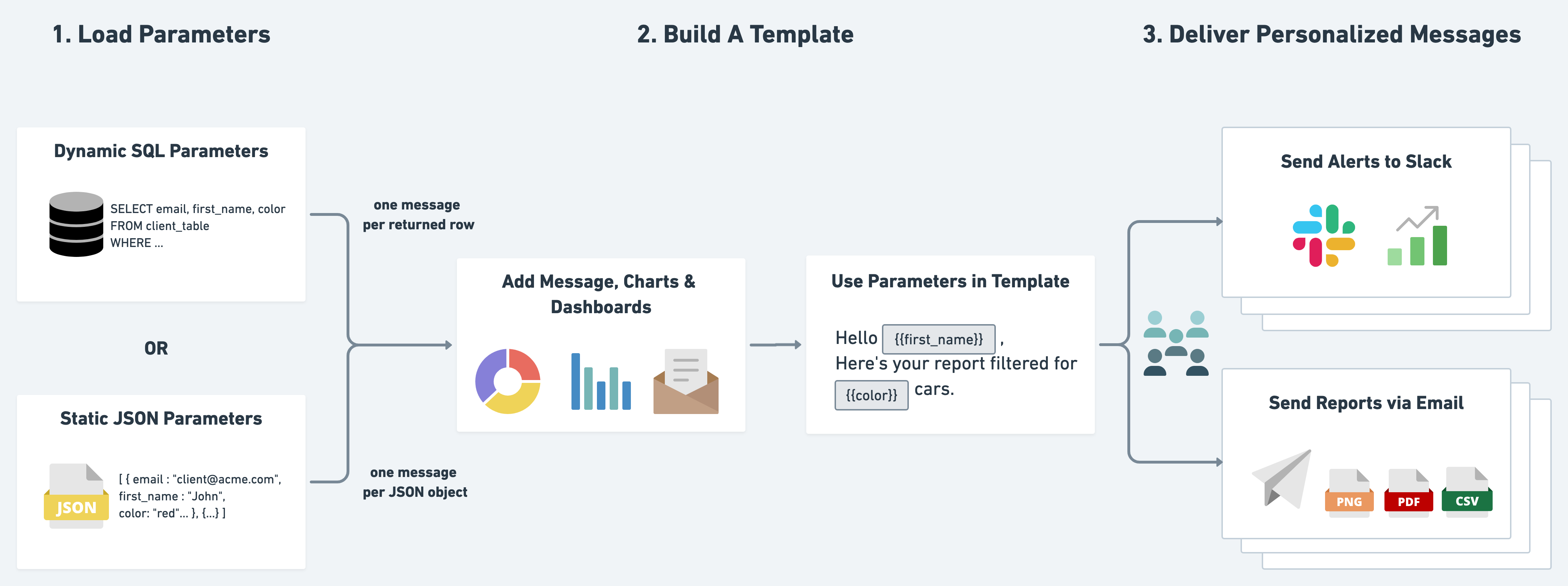 Deliver reports to any audience in Slack, via email, or upload to a cloud storage. Great for both internal stakeholders and external clients.